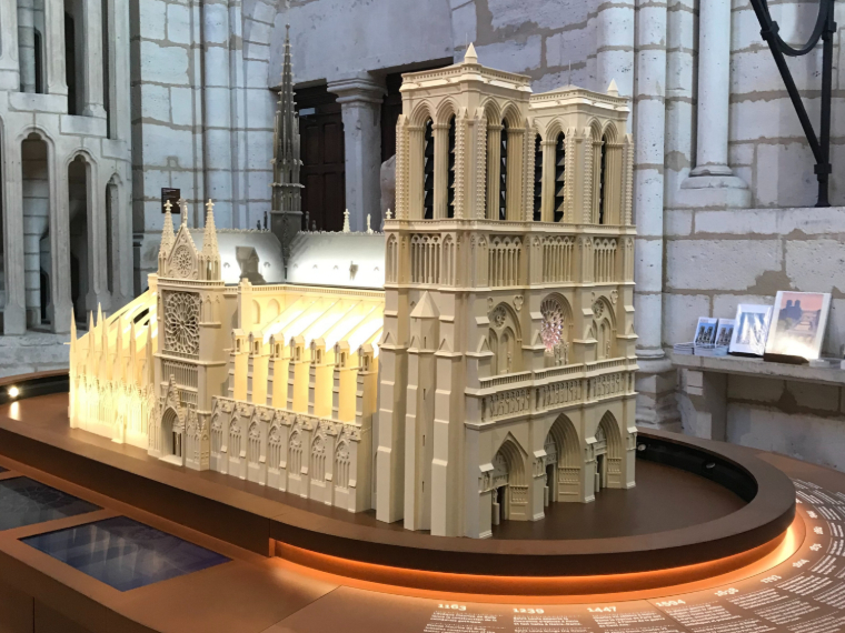 Autre amélioration, l’harmonisation du mobilier d’accueil de la cathédrale et des espaces muséographiques en faisant appel au même prestataire scénographique, l’agence Nathalie Crinière, et à la même agence de graphisme C-Album, bien qu’il s’agisse de marchés distincts, sous la maîtrise d’ouvrage de deux organismes différents : le Diocèse de Paris pour le comptoir d’accueil, la boutique de souvenirs dans l’église et de la muséographie du Trésor ; le CMN pour le parcours de visite des tours.